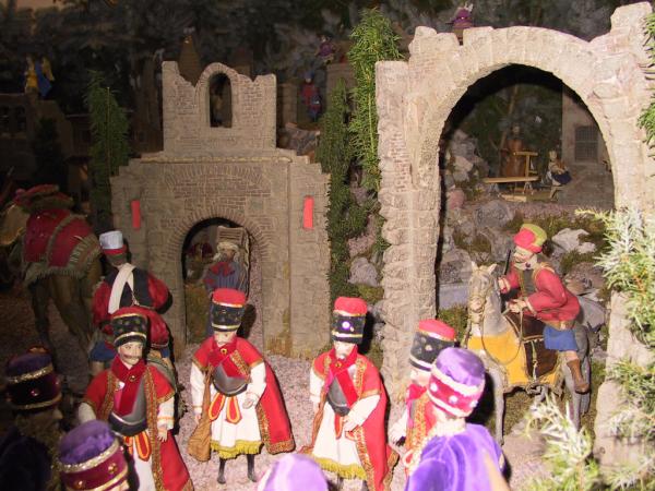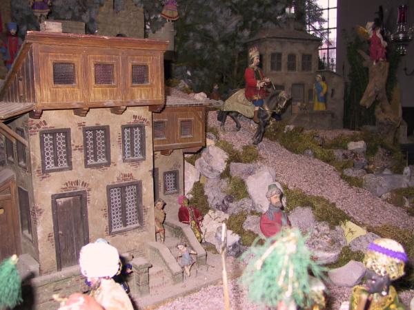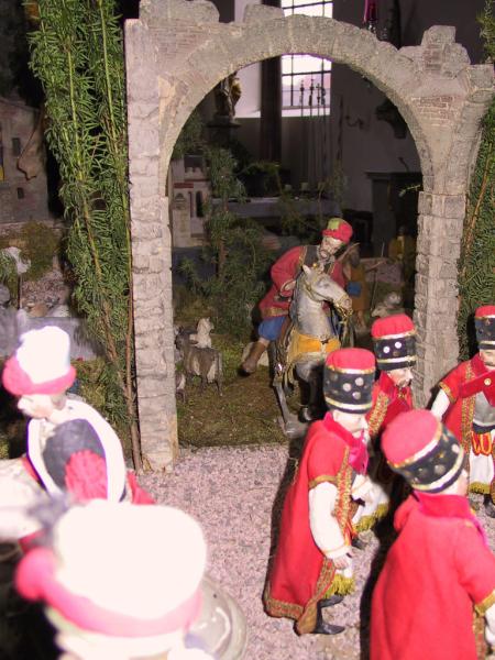 Die Figuren der Weisen aus dem Morgenland („Drei Könige“) sind mit ihrem überaus zahlreichen und prächtigen Gefolge aufgestellt. Die Geschenke von Gold, Weihrauch und Myrrhe, in goldenen Gefäßen und Schatullen, sind bereits vor der Krippe abgestellt. Die drei Weisen tragen kostbare, mit Perlen verzierte Turbane und Gewänder mit langen Schleppen; jeder hat eine Fahne in der Hand. Danach kommen die höher gestellten Begleiter, ebenfalls in prächtigen Gewändern, danach Mohren, ihrer Gestalt nach wesentlich kleiner, als Dienerschaft. Selbstverständlich fehlt auch ein Kamel mit Reiter und Führer und mit prächtigem Sattelzeug nicht. Der Elefant mit seinem Reiter in der Sänfte hat wohlursprünglich nicht dazugehört; das beweisen die kleinen Proportionen und der Reiter, der ganz und gar holzgeschnitzt ist, also keine textilen Gewänder trägt. Dahinter steht in einem Kreis der Hohe Rat, acht Figuren in leuchtenden Gewändern, Harnischen und Turbanen, die im Auftrag des Königs Herodes beraten, wo der neu geborene König der Juden sein sollte (vgl. Mt 2, 4 – 6).